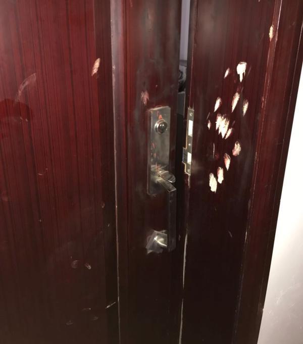 2017年7月9日,毛梁砸蒋娟住处房门留下的痕迹。