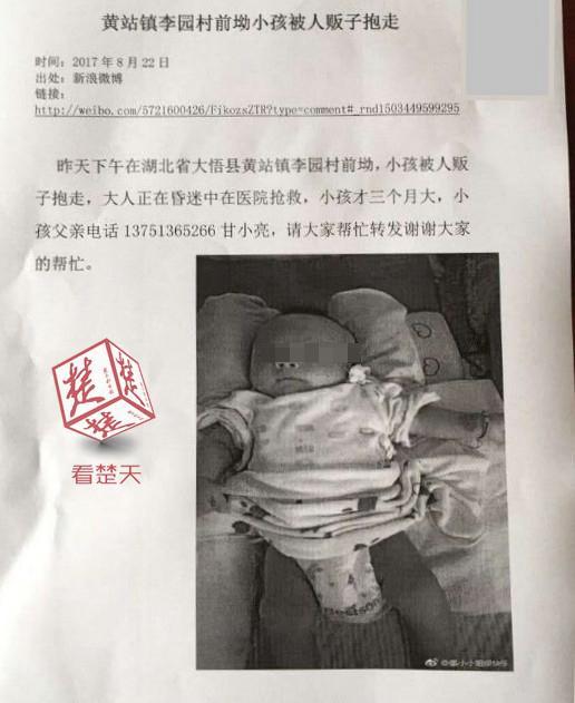 8月22日8时28分,大悟县公安局刑警大队接到报警,8月21日11时30分许,黄站镇李园村27岁的村民韦某,抱着自己两个月大的孩子小文在家门口树下等婆婆胡某时,被一男一女哄骗上一辆灰色面包车带走。8月22日凌晨4时许,韦某独自逃回家中并昏倒在家门口,后被其家人发现送往医院救治,婴儿小文被人贩子抱走生死未卜。