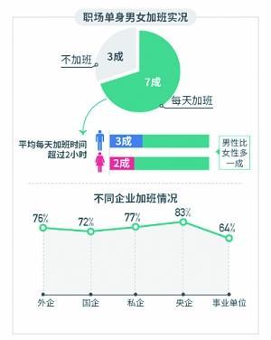 企业不同,加班的情况会有不同吗?调研显示,外企单身男女加班占比为76%,国企单身男女加班占比72%,私企单身男女加班占比为77%,央企单身男女加班占比为83%,事业单位单身男女占比仅为64%。