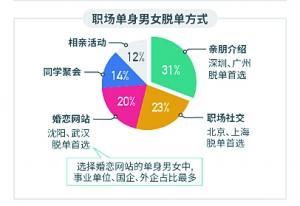 圈子小、工作忙,职场中的单身男女会选择何种方式脱单?报告显示,31%的单身男女找对象主要靠亲戚介绍,23%的单身男女选择通过职场社交脱单,20%的单身男女会积极寻求婚恋网站的帮助,15%的单身男女选择通过同学聚会脱单,12%的单身男女选择参与相亲活动脱单。