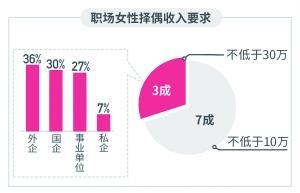 男生挣多少才能过职场女性择偶的最低门槛?调研显示,年收入10万是职场白领女性择偶的“最低门槛”,7成职场女性要求对方的年收入不低于10万,3成职场女性将最低标准设为30万。在对收入有要求的一线城市职场女性中,近8成要求对方收入30万以上。从企业差异看,要求男性收入不低于30万的职业女性中,外企女性占比为36%,国企女性占比为30%,事业单位女性为27%,私企女性占比为7%。
