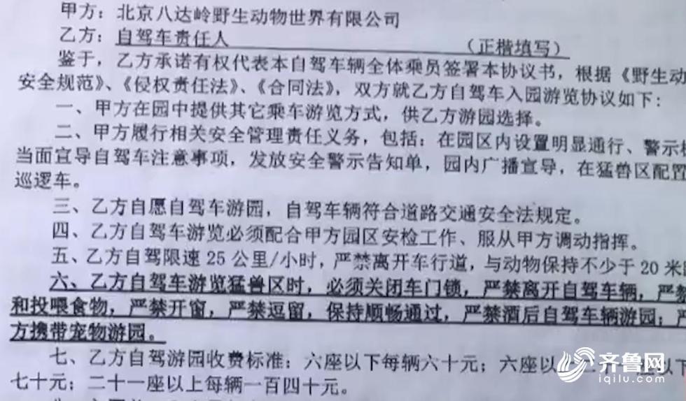 这份《自驾车入园车损责任协议书》也被网友戏称为生死契,里面第4条黑体加粗的明确写明严禁开窗、严禁喂食、严禁逗留,同时协议书的第十条也写明,甲乙双方有违上诉协议内容,各自承担相关责任。动物园方面表示,如果不签署这份协议,是没有办法进园游览的。