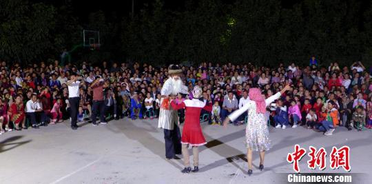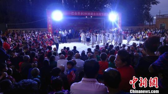 中新网新疆喀什9月3日电 (史玉江 休仁)9月2日,新疆喀什地区疏勒县巴合齐乡尤喀克斯日勒玛(2)村举办了“绽放美丽欢度古尔邦节群众文艺晚会”,2000余名民众在欢声笑语中共度不眠之夜。