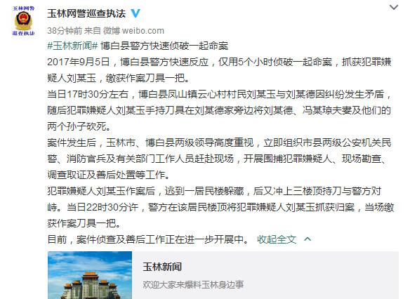 9月5日,博白县警方快速反应,仅用5个小时侦破一起命案,抓获犯罪嫌疑人刘某玉,缴获作案刀具一把。