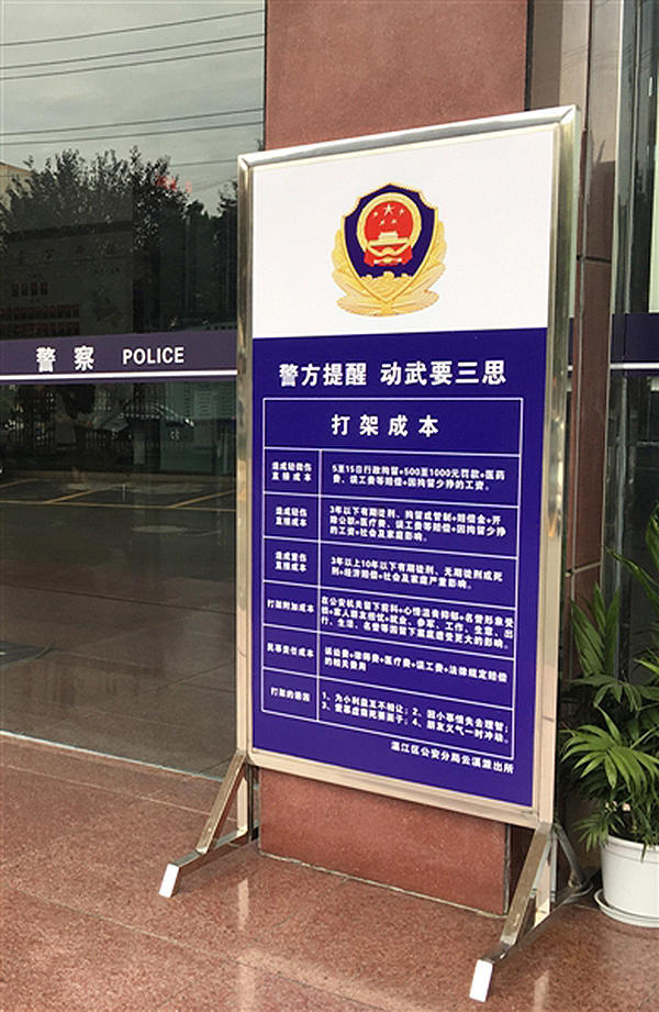 “我们注意到之前网络上流传的这份打架成本。”冯绍林向成都商报记者表示,他们借鉴了网上的内容,并制作成警示牌放在派出所门口。“给到派出所的人员做个警示,同时让打架参与者心里明确他们的行为将会面临的处罚。”