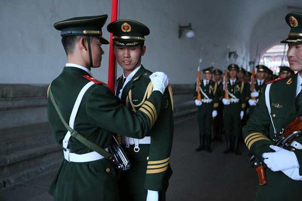 天安门国旗护卫队员升旗前整理衣冠。 天安门国旗护卫队 李超 供图