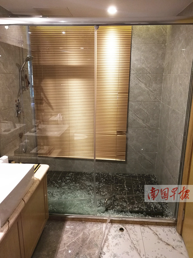 酒店洗澡间门爆裂,玻璃碎片洒了一地。记者 吕海锋摄