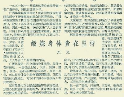 查阅老报纸后发现,每推行一套新的广播操,本报都会刊登它的图解。1952年,邮电部还发行过一套专题邮票。1955年,这套邮票又进行了再版。(1997年11月10日《北京日报》3版,《大家来做广播体操》)