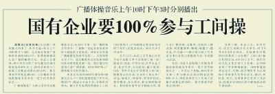 按照市总工会要求,2011年全市职工参与健身活动比例应达到60%以上,国有企业参与工间或工前操活动应达到100%,机关事业单位应达到70%,工间操的开展情况成为各单位一把手的考核指标之一。(2010年8月9日《北京日报》6版,《国有企业要100%参与工间操》)