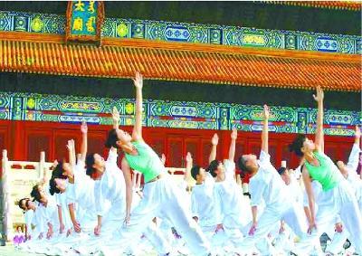 2010年,首都职工在劳动人民文化宫太庙前广场表演“新型”工间操。李继辉/摄