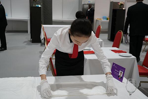她所参加的餐厅服务项目,比赛得分点高达上千个,稍有环节失误,就可能面临淘汰。她告诉澎湃新闻记者,自己没有过多紧张,抱着学习之心,坦然征战。