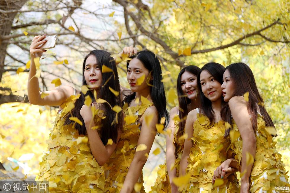 女大学生用银杏叶做“土豪金”时装