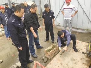 报警人丁伟是工地上的一名工人。“上午我在挖污水工作井,挖到1.5米至2米深时,忽然发现一个‘铁坨坨’。”丁伟说,挖出来后还拿在手里仔细看了下,工友们辨认后,断定它是一枚炸弹。“炸弹”锈迹斑斑、全身泥土,头大尾小,目测40厘米长、直径5厘米至7厘米左右。经过治安科和枪爆科民警现场测定,该炸弹为迫击炮炮弹,由于没有引线,一般情况不会爆炸,民警将其暂时放在一个装有泥沙的木箱里。