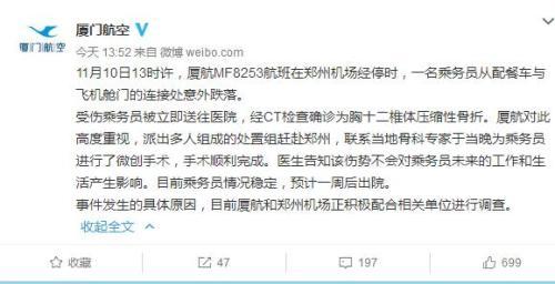 中新网11月11日电 据厦门航空官方微博消息,11月10日13时许,厦航MF8253航班在郑州机场经停时,一名乘务员从配餐车与飞机舱门的连接处意外跌落。受伤乘务员被立即送往医院进行手术,医生称该伤势不会对乘务员未来的工作和生活产生影响。