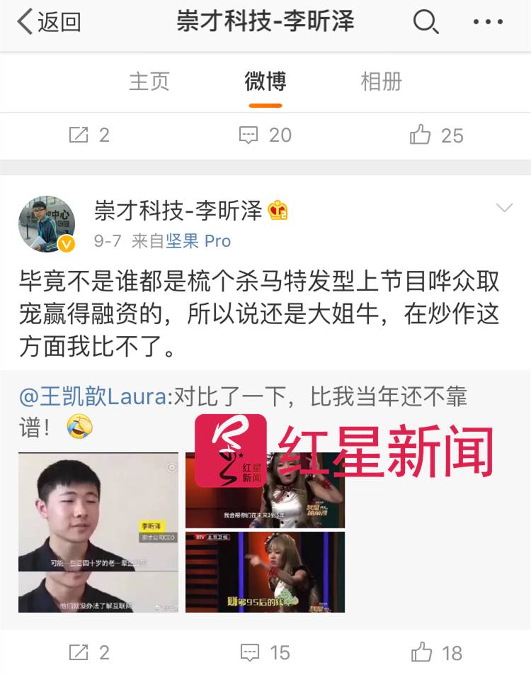 95后王凯歆发过一条关于李昕泽的微博,说:“比我当年还不靠谱!”王凯歆是1998年生人,高二辍学,创立“神奇百货”。之后,王凯歆融资上千万,却最终失败并招来非议。李昕泽看到后随即转发,配文写道:“毕竟不是谁都是梳个杀马特发型上节目哗众取宠取得融资的,所以说还是大姐牛,炒作这方面我比不了。”