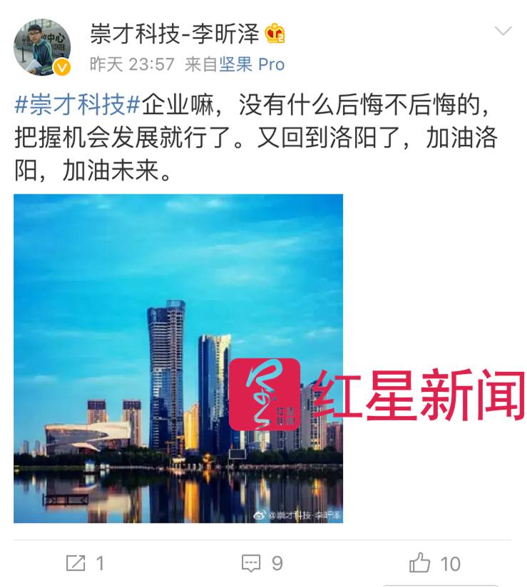 11月7日,李昕泽和副总裁张泽昊在北京碰面,见了一圈投资者和要建立“崇才生态圈”的合作伙伴。11月12日,李昕泽回到河南洛阳自己的家中。他又想起王凯歆在微博上的言论,凌晨发了微博:“企业嘛,没有什么后悔不后悔的……又回到洛阳了,加油洛阳,加油未来。”