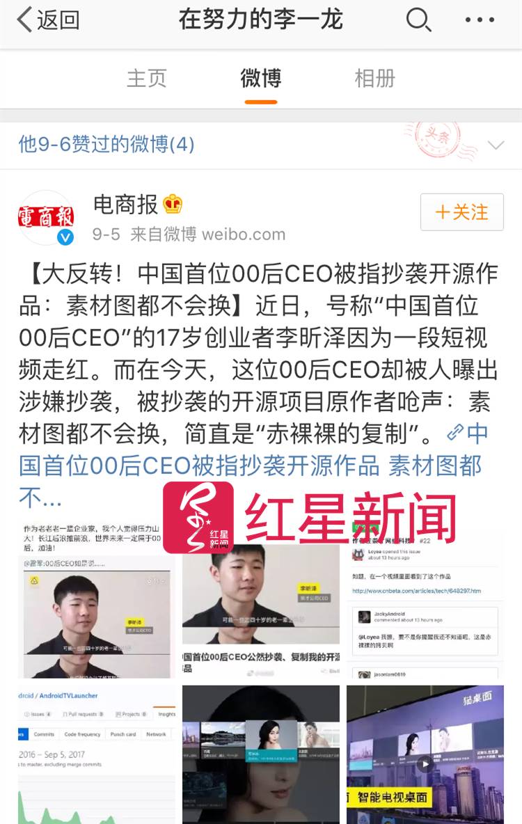 ▲李一龙在微博点赞了报道李昕泽抄袭的文章网络截图