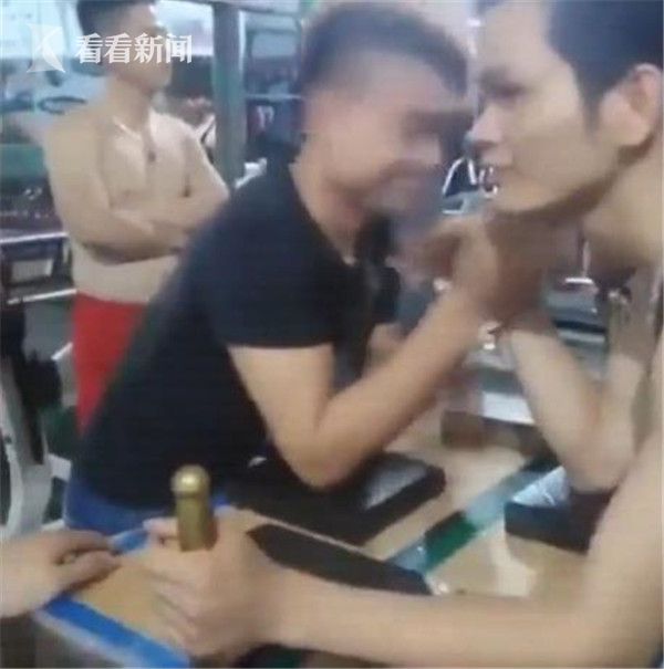 越南健身房内两名男子掰手腕时发生意外,一人手臂被向外折断。