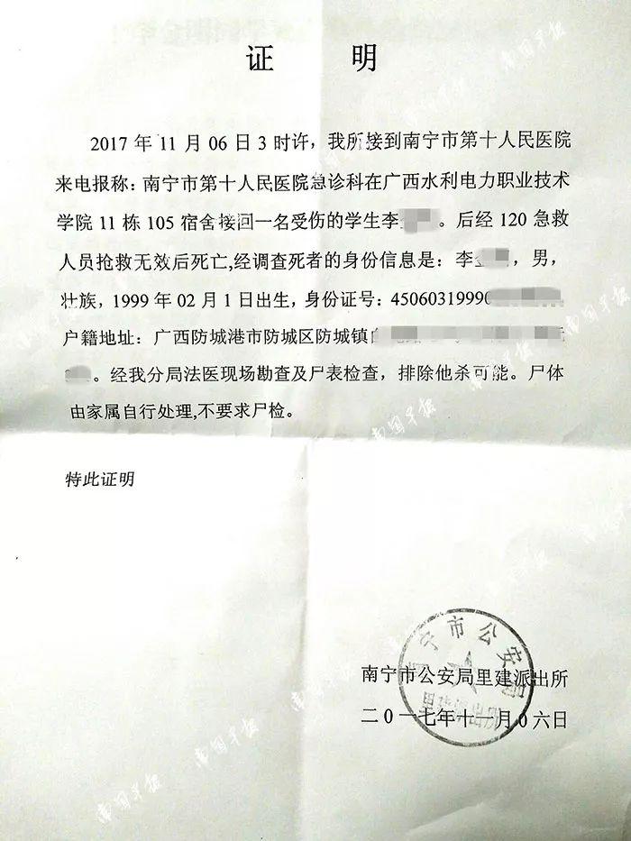 南宁市公安局里建派出所有关负责人介绍,经办案民警、法医勘查现场及尸表检查,并找小李的室友进行调查,排除他杀可能,认定系一起意外事件。