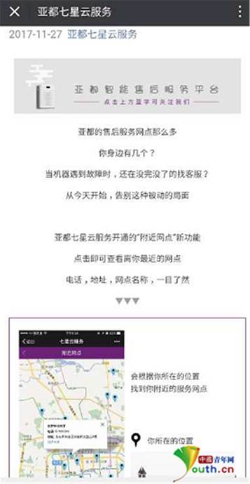 在亚都打造的智能售后“亚都七星云服务”平台上,其公开宣称:“亚都的售后服务网点那么多,你身边有几个?当机器遇到故障时,还在没完没了地找客服?从今天开始,告别这种被动的局面,亚都七星云服务开通的‘附近网点’新功能,点击即可查看离你最近的网点,电话、地址、网点名称,一目了然……”