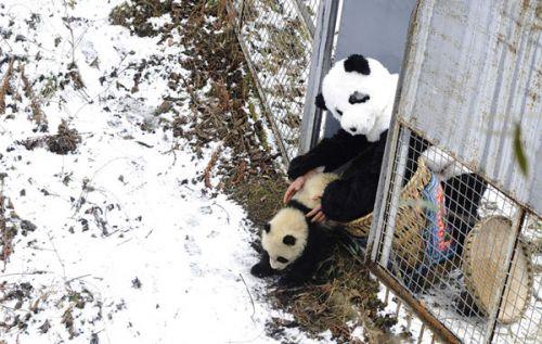 在核桃坪保护研究中心,一名饲养员穿着熊猫服装,把熊猫“淘淘”放进一个全新的围场之中。“放归野外”项目进入第二阶段,“淘淘”和它的妈妈已经被转移到一个更大的野生围场,接受更多野化训练。