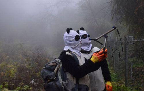 研究员戴着熊猫面罩,使用无线设备搜索熊猫“映雪”的位置,这只熊猫在放归野外之前,已经在保护基地接受过生存训练。