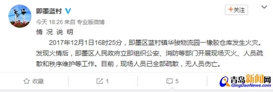 18点26分,即墨蓝村人民政府官微发布情况说明:2017年12月1日16时25分,即墨区蓝村镇华骏物流园一橡胶仓库发生火灾。发现火情后,即墨区人民政府立即组织公安、消防等部门开展现场灭火、人员疏散和秩序维护等工作。目前,现场人员已全部疏散,无人员伤亡。