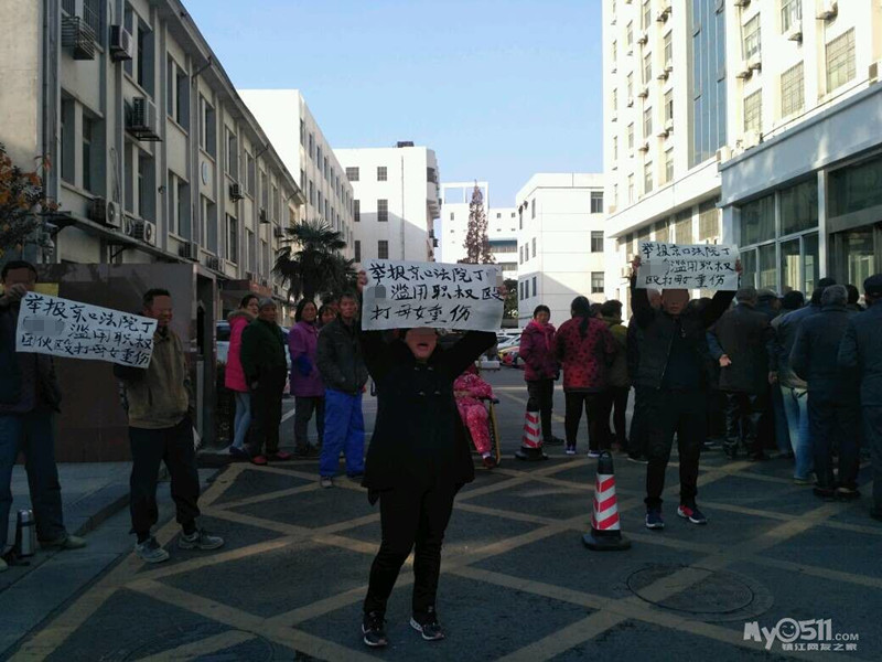 配图中,一群人聚集在镇江市中级人民法院门口,有3个人各举着一条横幅,横幅上写着“举报京口法院丁某滥用职权殴打母女重伤”。