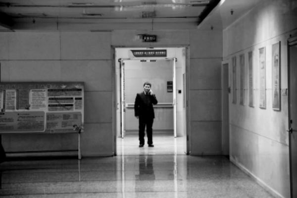 王辉(化名)坐在走廊靠北侧的椅子上,手里拿着两部手机。他时而双眉紧锁,时而又向四周张望。坐累了,就会站起来走走,打发无聊的时光。