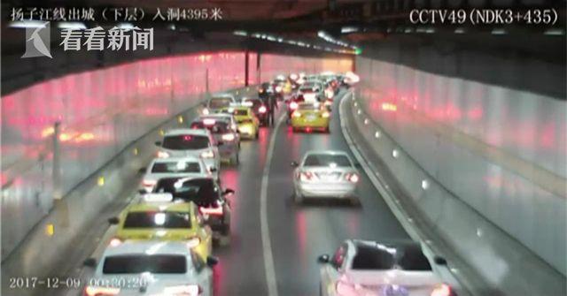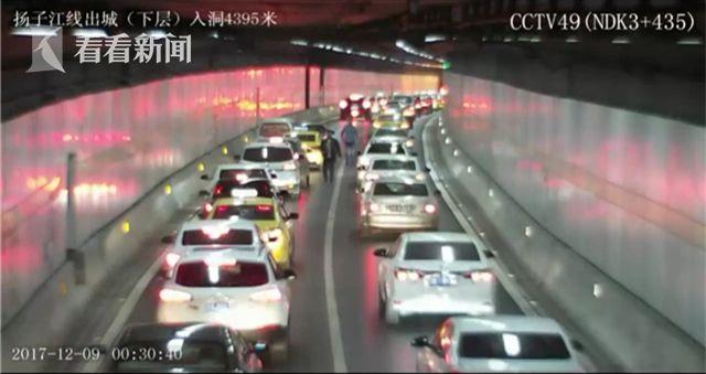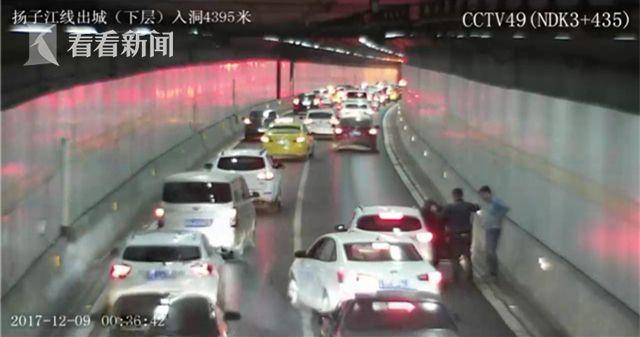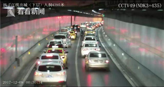 12月9日凌晨,南京扬子江隧道出城方向车流量较多,所有车辆都在耐心等待缓慢通行。突然有一辆黑色小车行驶异常缓慢,随后竟直接在左车道内停了下来。更离奇的是,小车上下来两名男子,不停拦截过往车辆。