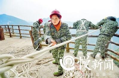 不过,即使在有同事协助拉绳的情况下,她也必须紧紧抓住绳的末端。她说,就算前面的人手滑没抓住绳子,她在后面也是拼命吊起的,“好歹我也有百多斤重,把绳子往我腰上一缠,就像捆在连二石上,他在下面啷个都稳当,就不会出啥子大事了。”