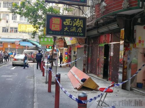 香港油麻地南京街一个招牌25日坠落,击伤3名非华裔男性路人。招牌面积约半米乘3米,由2至3米高处坠落。图片来源:香港电台网站。