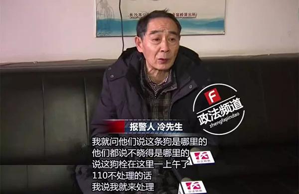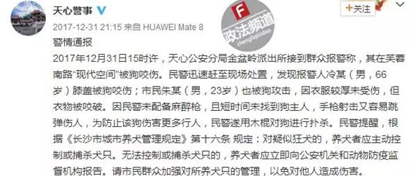 2017年12月31日15时许,天心公安分局金盆岭派出所接到群众报警称,其在芙蓉南路“现代空间”被狗咬伤。民警迅速赶至现场处置,发现报警人冷某,男,66岁,膝盖被狗咬伤,市民朱某,男,23岁,也被狗攻击,因衣服较厚未受伤,但衣服被咬破。因民警未配备麻醉枪,且短时间未找到狗主人,手枪射击又容易跳弹伤人,为防止该狗伤害更多行人,民警遂用木棍对狗进行扑杀。