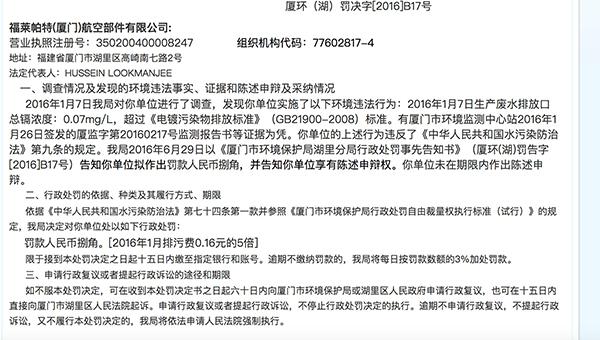 其中,被罚“8毛钱”的是福莱帕特(厦门)航空部件有限公司。厦环(湖)罚决字[2016]B17号行政处罚书显示,该公司在2016年1月生产废水排口总镉浓度超标,这一罚款金额是该公司当月0.16元排污费的5倍。
