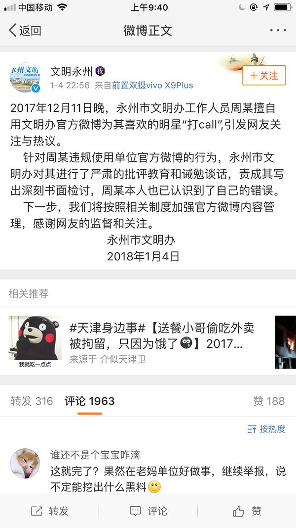 针对网友热议的“永州市文明办工作人员周某擅自用文明办官方微博为其喜欢的娱乐明星打call”一事,1月4日,湖南永州市文明办通过官方微博@文明永州 发布通报称,周某违规使用单位官方微博的行为,永州市文明办对其进行了严肃批评教育和诫勉谈话,已责成其写出深刻书面检讨,周某本人也认识到了自己的错误。