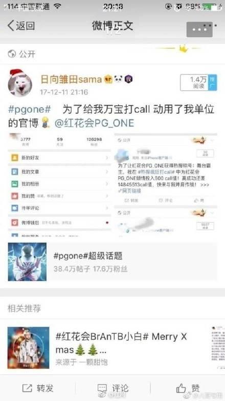 1月4日,澎湃新闻发现,尽管周某发布的有关给娱乐明星打call的内容已经删除,但从网友保留的截频了解得知,周某在利用其所在单位官方微博为自己喜欢的某娱乐明星“打call”后,还疑似通过个人微博发布消息称“为了我万宝打call,动用了我单位的官博@红花会PG_ONE(注:国内说唱歌手)”。