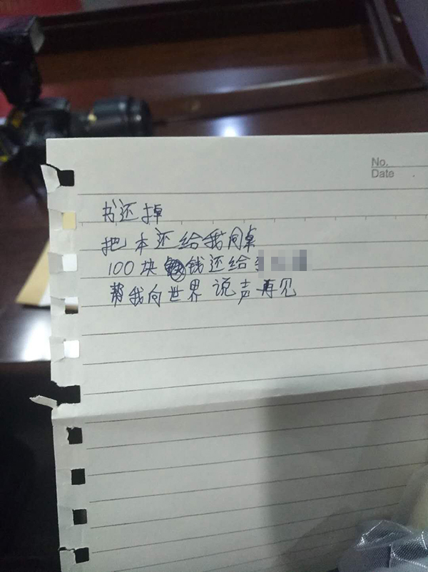 刘哲提供了一张魏某某所留遗书的照片。遗书写在一张被撕下来的日记本纸上:“书还掉, 把本(子)还给我同桌, 100块钱还给李某某, 帮我向世界说声再见。”