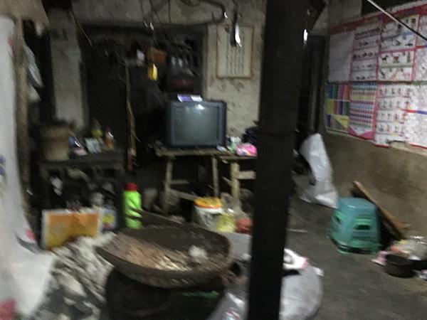 李高兵的家位于法地村田湾组10号,系独居,最近的邻居离他们家10米左右。门前是一片菜地,背后是一小片竹林。与周边的邻居相比,李高兵这幢白墙青瓦房显得有些破旧。其中,左侧房间“人畜共用”:一边是牛棚,另一边摆放着烤火炉、一台电视机、几张桌凳和两张床。