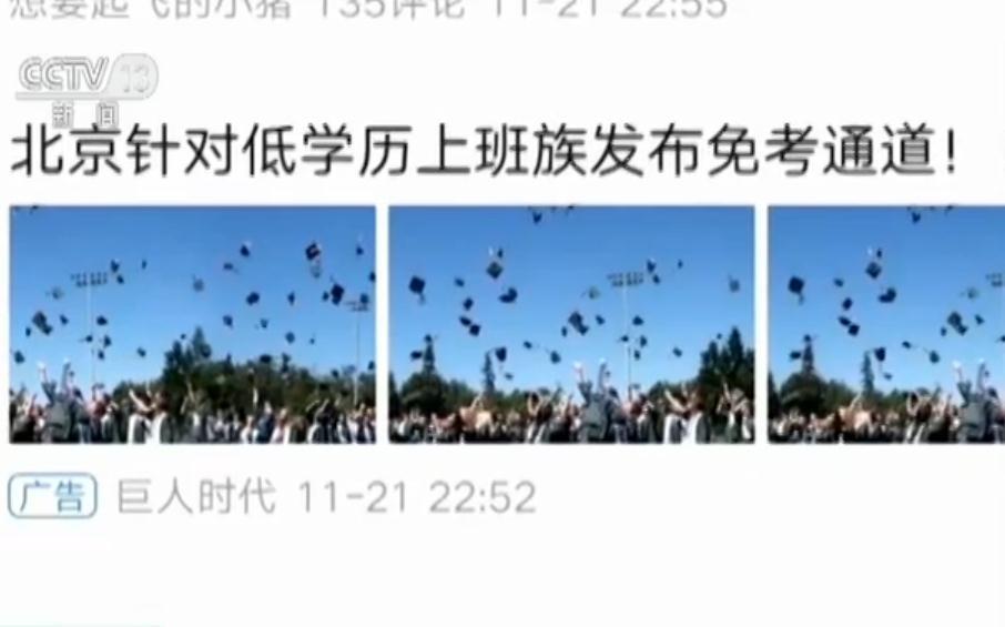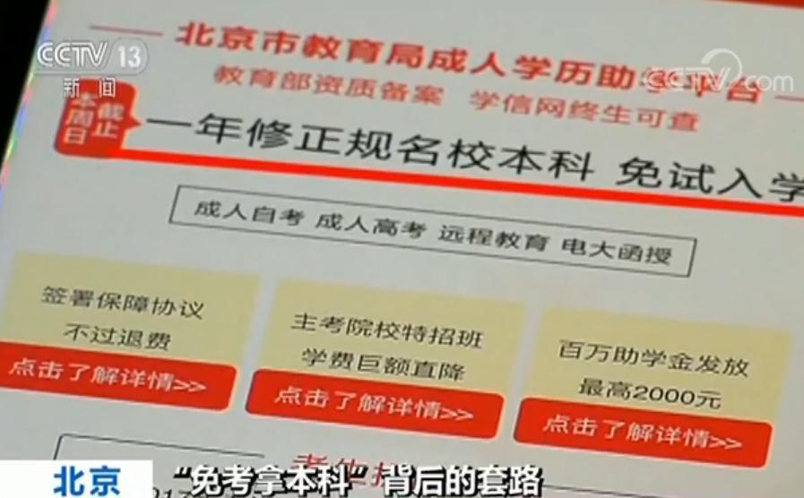 中国人民大学教育学院教授 程方平: 这个对于一个国家而言,这个学历是非常严肃的事情,它是都是要有这个主管部门通过正式的手续,包括考试,它是有标准的。企业或者一些商业广告,凡是给你许诺通过多交点钱就可以省事就可以免考,这些都是骗人的。所以这个对于消费者来讲,千万不要有这种侥幸啊投机的这样的心理。