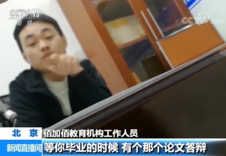 佰加佰教育机构工作人员(暗访): 说两万多(学费)那个呀就给我们就是经常合作,学校那个就是全程的,不用学习也不用考试,到毕业的时候还有那个论文答辩,你本人参加一下就可以了,其实就是你省事得花钱多一点,你能学能考试的这个学费肯定是花几千。