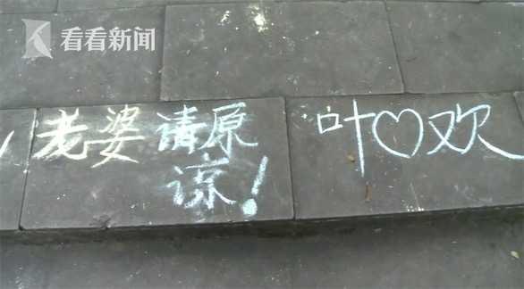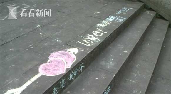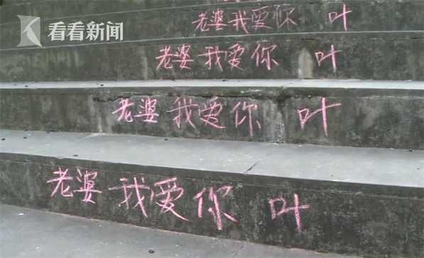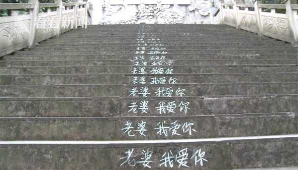 在香国公园这条上山的步道上,记者看到,每一级台阶上都用粉笔写着“老婆我爱你”几个大字,放眼望去,十分壮观。