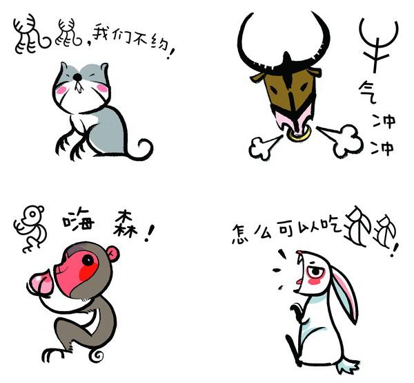除了《甲骨有表情》,陈楠工作室同时推出了表情包《生肖甲骨文》。“生肖甲骨文”基于“汉仪陈体甲骨文字库”中的动物文字进行再创和绘制,将几何化的甲骨文字转化成更加直观形象的角色。