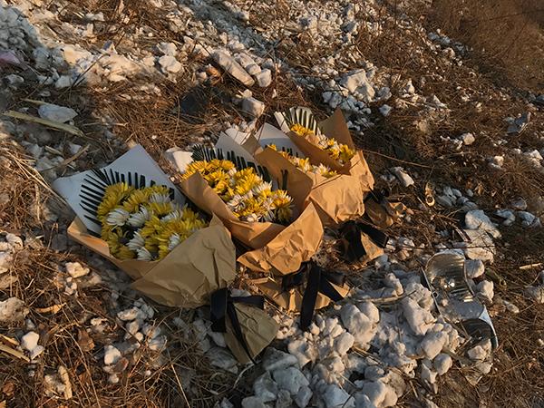 事故现场仍然残留车祸的痕迹。几片黑色的车外壳碎片散落在地上,车辆倾覆的陡坡被积雪覆盖,黄褐色的杂草从雪中钻了出来,有人在坡底的树下放了四束菊花。这一段公路右侧没有护栏,距离事发点大约20步有一个,已经歪斜着埋进了雪里。
