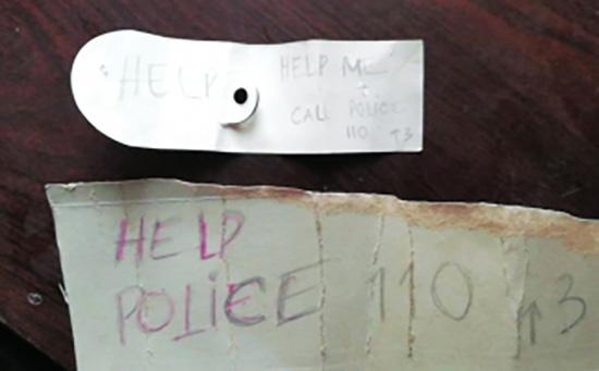 接到指令后,民警迅速赶到事发小区,并见到了报警群众。报警群众是一位在楼下开饭店的老板,据该老板介绍,当时他刚走到楼下,一张纸条从头顶落了下来,他捡起来一看,上面写着“110”“helpme”(救命)和“police”(警察)等字样,怀疑是有人从楼上发出的求救信号,于是他就报了警。