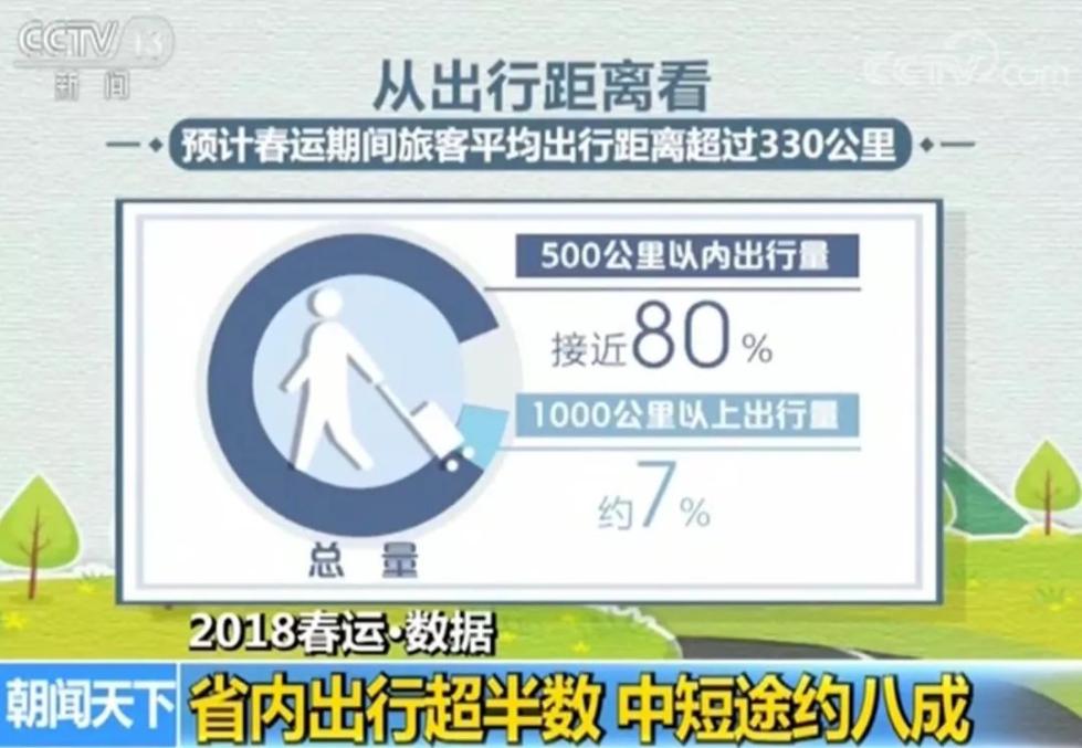 从出行距离看,预计春运期间旅客平均出行距离超过330公里,500公里以内出行量占总量的比例接近80%,1000公里以上出行量占比约为7%,旅客出行以中短途为主。