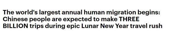 今年也不例外。中国这边春运才刚开始,外媒们就火急火燎地送上“震惊体”标题:“史诗般”的人类旅行、“地球最大规模人类迁徙”……