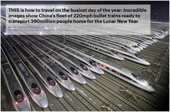 ▲英国《每日邮报》:“不可思议的照片展示时速220英里的中国高铁是如何迎接3.9亿人次的春运”