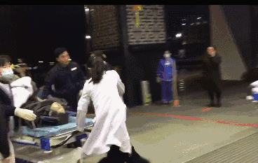 0时57分,又有一名伤者被送到医院,伤者从救护车下来时还插着救生仪器。