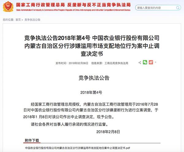 2月8日,国家工商总局网站发布了《竞争执法公告2018年第4号 中国农业银行股份有限公司内蒙古自治区分行涉嫌滥用市场支配地位行为案中止调查决定书》(下称“竞争执法公告”),将一起农业银行内蒙古分行涉嫌垄断行为的案子拉进了公众视线。