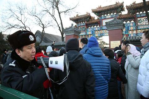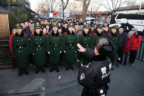 此外,东城警方采用分段限流的方式,将雍和宫大街南口至雍和宫西门分成七段,每段之间保持一定间隔,段内人流控制在200人左右,由民警、保安和武警手拉手形成人墙,每当雍和宫内达到1万人的饱和值时,限制进入,由人墙隔断。可以进人时,人墙打开,人流依次进入,直至下一护送段。